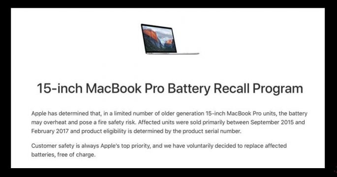 แอปเปิลเรียกคืนแมคบุ๊กโปรรุ่นเก่าขนาด 15 นิ้วจอเรตินาที่จำหน่ายระหว่างเดือนก.ย. 58 ถึงก.พ. 60 เพราะแบตเตอรี่อาจร้อนจัดจนเสี่ยงเกิดไฟไหม้ได้