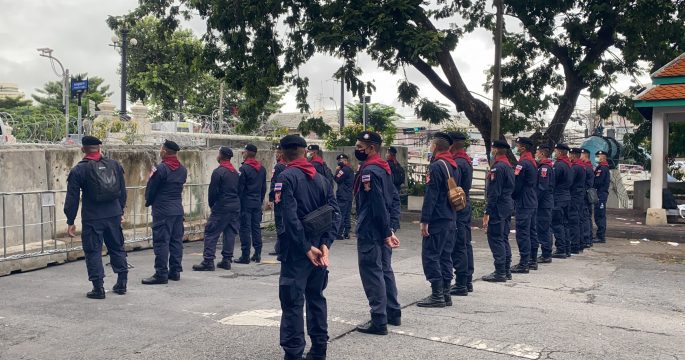 ทำเนียบ ตรึงกำลังเจ้าหน้าที่กองบังคับการตำรวจนครบาล8 รักษาความปลอดภัย 2กองร้อย พร้อมตั้งแบริเออร์ปูนและลวดหนามกั้น ปิดทางเข้าออกแน่น ห้ามรถทุกชนิดเข้าทำเนียบ