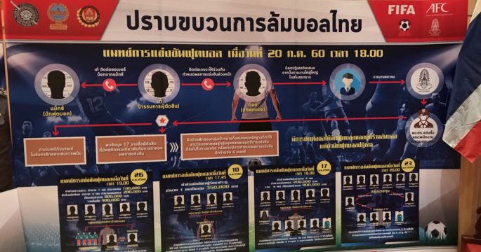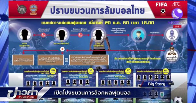 ผบ.ตร.แถลงผลการจับกุมนักฟุตบอล ผู้ตัดสิน และกลุ่มนายทุนเกี่ยวข้องกับการล็อกผลบอล โดยก่อนไปฟังการแถลงข่าวเราจะมาดูแผนผังขบวนการล้มบอลกันก่อน