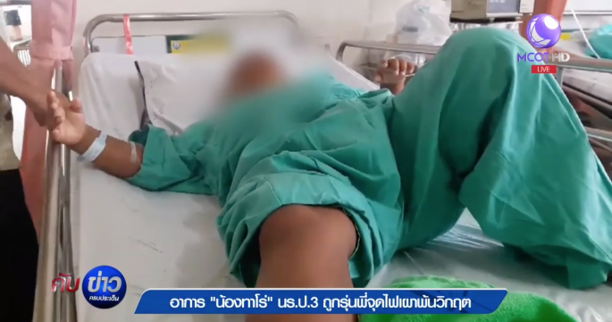 “น้องทาโร่” ถูกรุ่นพี่รุมจับแล้วใช้แอลกอฮอล์ราดตัวจุดไฟเผา ล่าสุดอาการพ้นวิกฤต แต่แพทย์ต้องดูแลอย่างใกล้ชิดเกรงแผลจะติดเชื้อ