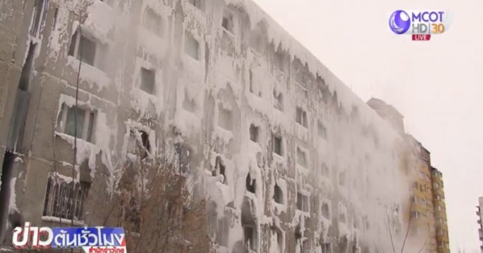 อาคารที่อยู่อาศัยแห่งหนึ่งในเมืองเออร์คุตส์ของรัสเซีย ถูกปกคลุมด้วยแผ่นน้ำแข็งทั้งด้านนอกและในอาคาร หลังจากท่อน้ำร้อนภายในอาคารแตกชำรุด