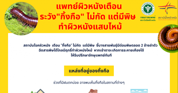 สถาบันโรคผิวหนัง กรมการแพทย์ เตือนประชาชนในช่วงหน้าฝนให้ระมัดระวัง “กิ้งกือ” แม้จะไม่ใช่สัตว์อันตราย ไม่กัด แต่มีพิษ ที่ส่งผลให้ผิวหนังระคายเคืองได้