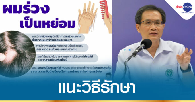 กรมการแพทย์ โดยสถาบันโรคผิวหนัง แนะนำวิธีการรักษาโรคผมร่วงเป็นหย่อม พร้อมอธิบายลักษณะของโรค โรคผมร่วงเป็นหย่อมอาจกลับมาเป็นซ้ำได้ แนะนำให้เข้ามาปรึกษาแพทย์ เพื่อวางแผนการรักษาและการใช้ยาที่ถูกต้องเหมาะสม