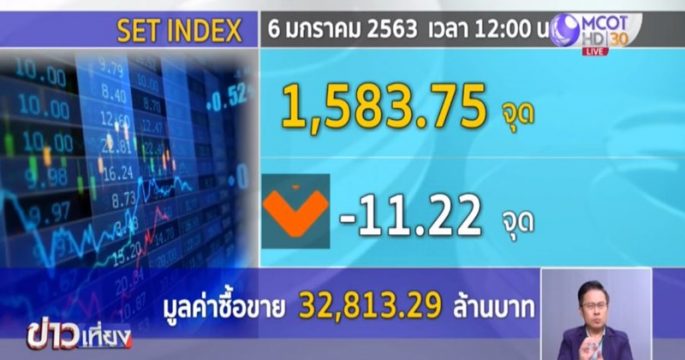 หุ้นไทยภาคเช้าร่วงกว่า 10 จุด ตอบรับสถานการณ์ตะวันออกกลางตึงเครียด ดัชนีช่วงเที่ยงปิด -11.22 จุด ที่ระดับ 1,583.75 จุด มูลค่าการซื้อขาย 32,813.29 ล้านบาท