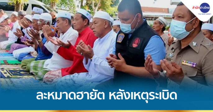 โต๊ะครูสอนศาสนา ตำรวจ และประชาชน ในพื้นที่ ต.บางนาค จ.นราธิวาส ร่วมกันประกอบพิธีละหมาดฮายัต เพื่อปัดเป่าสิ่งชั่วร้าย หลังเกิดเหตุระเบิดแฟลตตำรวจ