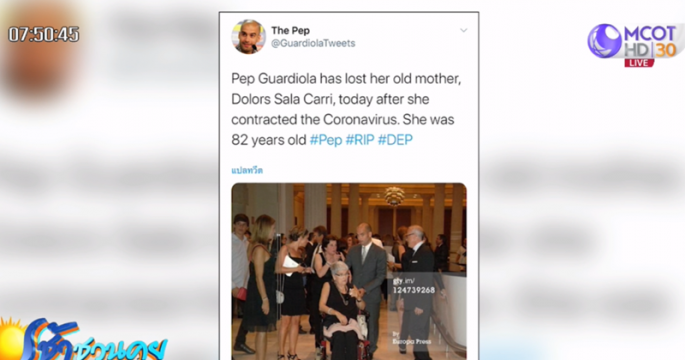 โดลอร์ส ซาลา การ์ริโอ มารดาของ เป๊ป กวาร์ดิโอลา ผู้จัดการทีม “เรือใบสีฟ้า” แมนเชสเตอร์ ซิตี้ ในศึกพรีเมียร์ลีก อังกฤษ เสียชีวิตด้วยวัย 82 ปี หลังโชคร้ายติดเชื้อโควิด-19