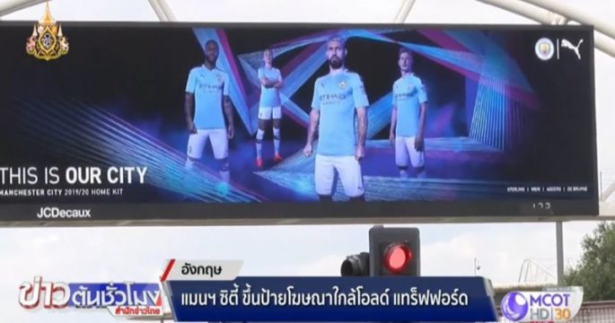 แมนเชสเตอร์ ซิตี้ ขึ้นป้ายโฆษณาชุดแข่งใหม่ทั้งเหย้าและเยือน ประจำฤดูกาล 2019-2020 ใกล้ๆ กับสนามโอลด์ แทรฟฟอร์ด สนามเหย้าของทีมแมนเชสเตอร์ ยูไนเต็ด