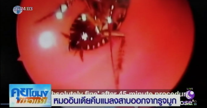 แพทย์อินเดียคีบแมลงสาบตัวเป็นๆ ออกจากรูจมูกของหญิงวัย 42 ปี หลังเธอทนทรมานจากความรู้สึกเหมือนมีแมลงไต่อยู่ข้างในนาน 12 ชั่วโมง คาดมันคลานเข้าทางรูจมูก ขณะเธอนอนหลับกลางดึก