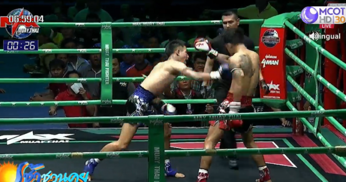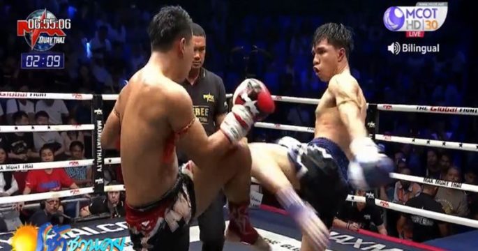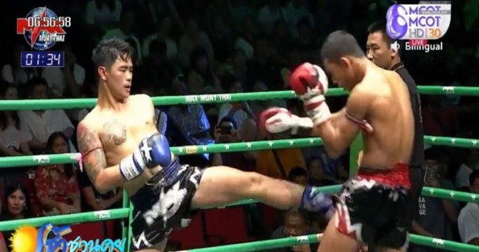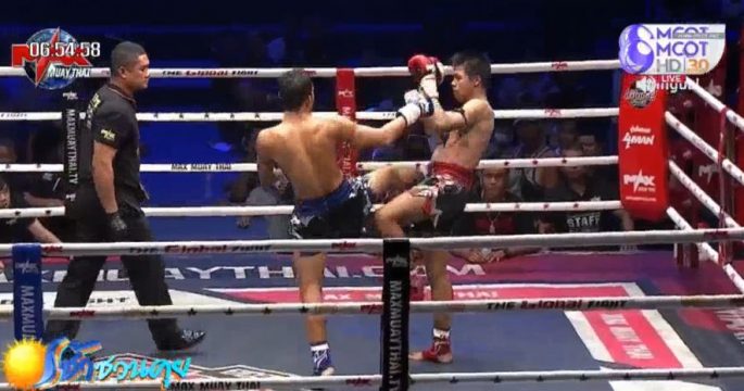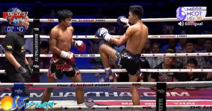 ยักษ์เล็ก ศิริสุขยิม จากสกลนคร มุมน้ำเงิน เตะก้านคอ ป๊อปอาย สิงหเดชายิม แชมป์มวยรอบแม็กซ์มวยไทย จากบุรีรัมย์ ลงไปน็อกยก 2 ศึกแม็กซ์มวยไทย