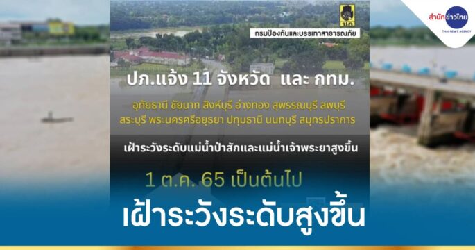 ปภ.แจ้ง 11 จังหวัด และ กทม. เฝ้าระวังสถานการณ์ระดับน้ำในแม่น้ำป่าสักและแม่น้ำเจ้าพระยาเพิ่มสูงขึ้น ตั้งแต่วันที่ 4 ต.ค.เป็นต้นไป