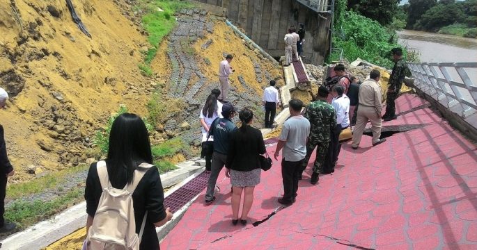 สระบุรี 11 มิ.ย.- ชุมชนวัดเพรียวริมน้ำป่าสักเริ่มวิตกแนวกั้นตลิ่งทรุดตัวลึกกว่า 3 เมตร เผยได้ยินเสียงครืนช่วงเช้ามืด ด้าน ปภ.สระบุรีเร่งประสานหน่วยงานแก้ไข คาดดินชุ่มฝนหลายวัน ว่าที่ร้อยตรี ณัฐพงค์ ฐิตวิกรานต์ หัวหน้าสำนักงานป้องกันและบรรเทาสาธารณภัยจังหวัดสระบุรีรายงานความเสียหายแนวกั้นตลิ่งแม่น้ำป่าสักทรุดตัวบริเวณชุมชนวัดศรีบุรีรัตนาราม (วัดเพรียว) ต.ปากเพรียว อ.เมือง ไปยังผู้ว่าราชการจังหวัด พร้อมประสานหน่วยงานเกี่ยวข้องเร่งตรวจสอบและหาทางแก้ไข เนื่องจากแนวกั้นตลิ่งทรุดยาว 150 เมตร และลึกกว่า 3 เมตร เกรงว่าจะเกิดการทรุดตัวได้อีกและอาจลามมาถึงบ้านเรือนประชาชน ส่วนสาเหตุคาดว่าฝนตกสะสมช่วงที่ผ่านมาและเมื่อคืนนี้ฝนตกหนักอีก อาจทำให้ดินริมตลิ่งอ่อนตัว ผู้สื่อข่าวรายงานเพิ่มเติมว่า จากการสอบถามชาวบ้านทราบว่าช่วงเช้ามืดได้ยินเสียงลั่นสะเทือนมาจากพื้นดิน จึงออกมาดูพบว่าลานออกกำลังกายและริมตลิ่งยุบลงไปในแม่น้ำป่าสัก หากไม่รีบป้องกันอาจกระทบกับถนนและบ้านเรือนได้.-สำนักข่าวไทย