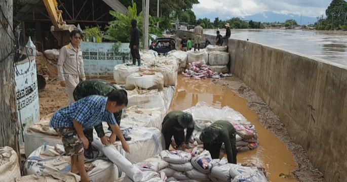 แม่น้ำขึ้นสูงผุดด้านหลังวัดไทยชุมพล เจ้าหน้าที่ห่วงปัญหาน้ำท่วม เร่งวางบิ๊กแบ็กป้องกันเขตเทศบาลเมืองสุโขทัยธานี