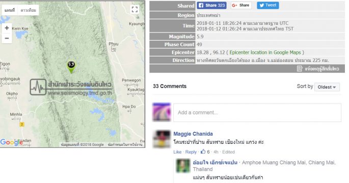 เกิดเหตุแผ่นดินไหวขนาด 5.9 ศูนย์กลางในเมียนมา ห่างจาก อ.เมือง จ.แม่ฮ่องสอน ประมาณ 224 กม. เมื่อกลางดึกที่ผ่านมา รู้สึกสั่นไหวได้ถึง จ.เชียงใหม่ และอาคารสูงใน กทม.