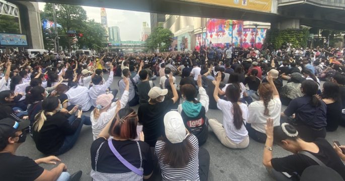 ม็อบคณะราษฎร ปิดแยกราชประสงค์สำเร็จ เผชิญหน้าตำรวจไม่สนเส้นตายประกาศจับดำเนินคดี ตามประกาศสถานการณ์ฉุกเฉิน ด้านไมค์ ระยอง ปราศรัยยันไม่ถอย