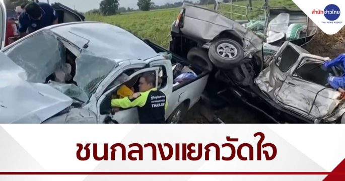 กระบะขนคนกลับจากงานบุญกฐิน ชนกระบะอีกคันกลางสี่แยกวัดใจ ต.หนองผักแว่น อ.ท่าหลวง จ.ลพบุรี เสียชีวิต 1 ราย บาดเจ็บ 13 ราย