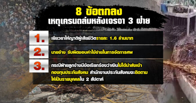 เจรจาจนได้ข้อสรุป จ่ายเงินเยียวยาเหยื่อเครนถล่ม ศพละ 1,600,000 บาท จ่ายก่อน 5 แสนบาท ส่วนที่เหลือจ่ายให้ภายใน 3 เดือน