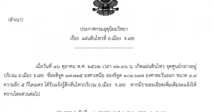 ผู้ว่าฯ เลย กำชับเฝ้าระวังผลกระทบ หลังเกิดแผ่นดินไหวช่วงเที่ยง ขนาด 3.8 จุดศูนย์กลาง อ.เมือง รู้สึกแรงสั่นสะเทือนหลายพื้นที่ เบื้องต้นยังไม่มีรายงานความเสียหาย