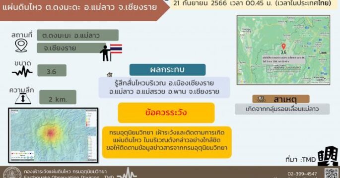กรมอุตุฯ รายงานแผ่นดินไหวขนาด 3.6 ต.ดงมะดะ อ.แม่ลาว จ.เชียงราย กลางดึกที่ผ่านมา รับรู้แรงสั่นไหวหลายอำเภอ ยังไม่มีรายงานความเสียหาย