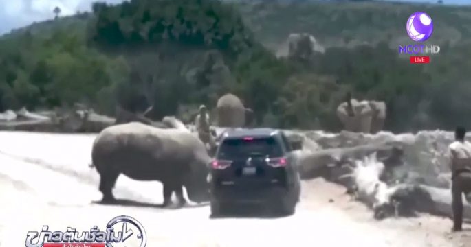 แรดขนาดใหญ่กำลังขวิดรถยนต์นักท่องเที่ยวที่เข้ามาชมสวนสัตว์เปิดในรัฐพูเอ-บลา ทางภาคกลางของเม็กซิโก