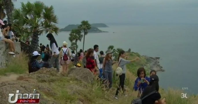 นักท่องเที่ยวจำนวนมากมาปักหลัก เฝ้ารอชมความสวยงามของพระอาทิตย์ตก และส่งแสงสุดท้ายของปี 2559 ที่แหลมพรหมเทพ แต่ต้องผิดหวังจากสภาพอากาศไม่เอื้ออำนวย