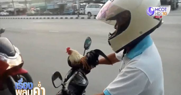 เป็นความบังเอิญที่ผู้สื่อข่าวไปพบเห็นในตลาดเมืองบ้านฉาง จังหวัดระยอง ภาพของหนุ่มใหญ่ขี่รถจักรยานยนต์อยู่บนถนน มีไก่ตัวหนึ่งเกาะอยู่บนกระจังหน้ารถจักรยานยนต์ ไม่มีอาการตกใจหรือกลัวให้เห็น แถมยังตีปีกขันไปตามทางอีกด้วย