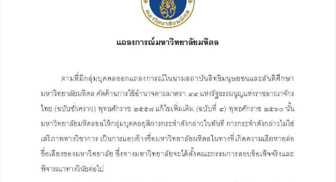 ม.มหิดล ออกแถลงการณ์ชี้แจงถูกกลุ่มบุคคลอ้างสถาบันสิทธิมนุษยชนฯ ม.มหิดล ออกแถลงการณ์คัดค้านการใช้มาตรา44 สร้างความเสียหาย เตรียมตั้ง คกก.สอบข้อเท็จจริง