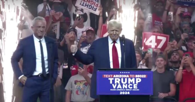 นายโรเบิร์ต เอฟ เคนเนดี จูเนียร์ ผู้สมัครอิสระ ขึ้นเวทีสนับสนุนนายโดนัลด์ ทรัมป์ ตัวแทนพรรครีพับลิกันชิงตำแหน่งประธานาธิบดีสหรัฐ หลังจากถอนตัวจากการแข่งขันในวันเดียวกัน