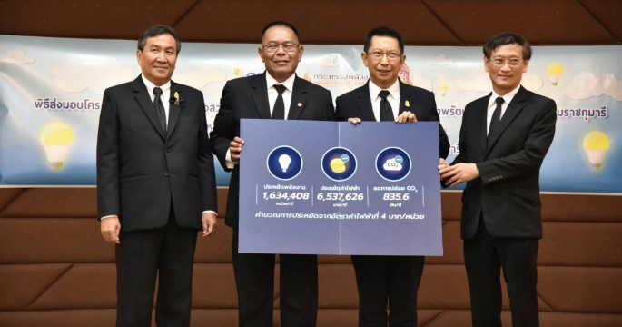 กฟผ. ส่งมอบผลการดำเนินโครงการเปลี่ยนอุปกรณ์แสงสว่าง LED เฉลิมพระเกียรติ 60 พรรษา สมเด็จพระเทพรัตนราชสุดา ฯ สยามบรมราชกุมารี แก่สำนักงาน กปร. 20,674 หลอด ลดการใช้พลังงานไฟฟ้า 1.6 ล้านหน่วยต่อปี ลด CO2 ได้ 835 ตันต่อปี