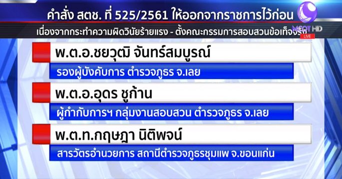 สำนักงานตำรวจแห่งชาติ มีคำสั่งให้ 3 นายตำรวจออกจากราชการ หลังผลการสอบสวนพบกระทำผิดวินัยร้ายแรง ยักยอกเงินสหกรณ์ออมทรัพย์ตำรวจจังหวัดเลย พร้อมทั้งสั่งย้าย 15 ตำรวจไปปฏิบัติราชการที่ สตช.