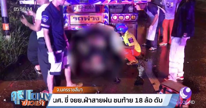 นักเรียน ปวส. วิทยาลัยเทคนิคนครราชสีมา วัย 18 ปี ซิ่งรถจักรยานยนต์ฝ่าสายฝน พุ่งชนท้ายรถ 18 ล้อ จอดเข้าห้องน้ำหน้าปั๊ม เสียชีวิตคาที่