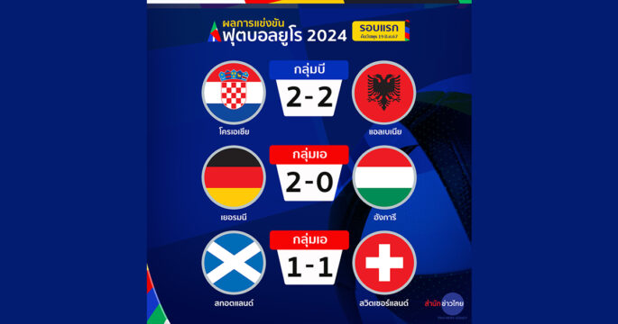 เยอรมนี ชาติเจ้าภาพ ผ่านเข้ารอบ 16 ทีมสุดท้าย ฟุตบอลยูโร 2024 เป็นทีมแรก ขณะที่โครเอเชีย ถูกแบ่งแต้มช่วงทดเวลาบาดเจ็บ มีโอกาสสูงที่จะตกรอบแรก