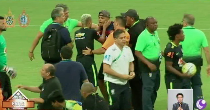 เนย์มาร์ และนักเตะทีมชาติบราซิล ถูกแฟนบอลที่คลั่งไคล้วิ่งฝ่าการป้องกันของเจ้าหน้าที่ลงไปกอดและขอถ่ายรูป หลังจบการฝึกซ้อมก่อนพบโคลอมเบีย