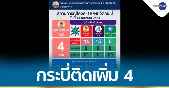 กระบี่พบผู้ติดเชื้อโควิด-19 เพิ่มอีก 4 คน พบไปพื้นที่เสี่ยงสนามมวยใน อ.จะนะ จ.สงขลา และนั่งรถทัวร์กรุงเทพฯ-กระบี่