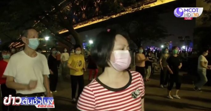 ชาวอู่ฮั่นสวมหน้ากากเต้นรำหมู่ ริมฝั่งแม่น้ำแยงซี โดยเว้นระยะห่าง 1 เมตร ขณะที่เมื่อวานนี้ จีนมีผู้ติดเชื้อโควิด-19 รายใหม่เพียง 5 คน ลดจาก 8 คนเมื่อวันศุกร์