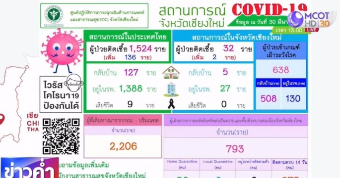 สสจ.เชียงใหม่แถลงมีผู้ติดเชื้อโควิด-19 เพิ่มอีก 2 ราย รวมป่วยสะสม 32 ราย ที่สุพรรณบุรี พบอีก 1 รวมเป็น 2 ราย ส่วนหนองบัวลำภู พบรายที่ 2 เป็นสาวเชียร์บาร์ค็อกเทลที่พัทยา จ.ชลบุรี และไปกินหมูกระทะกับเพื่อนอีก 5 คน