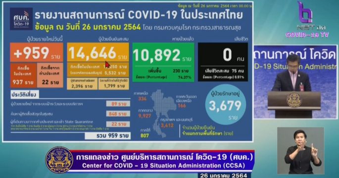 วันนี้พบผู้ป่วยโควิดรายใหม่ 959 ราย ผู้ป่วยยืนยันสะสม 14,646 ราย หายป่วยแล้ว 10,892 ราย เสียชีวิตสะสม 75 ราย