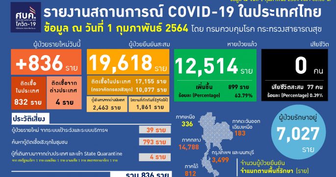 พบผู้ป่วยรายใหม่ 836 ราย ผู้ป่วยยืนยันสะสม 19,618 ราย หายป่วยแล้ว 12,514 ราย เสียชีวิตสะสม 77 ราย