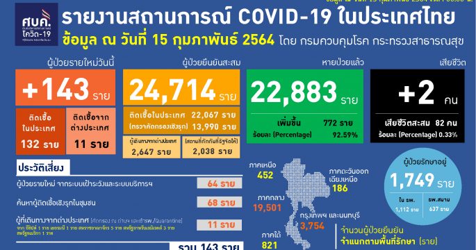 พบผู้ป่วยรายใหม่ 143 ราย ผู้ป่วยยืนยันสะสม 24,714 ราย หายป่วยแล้ว 22,883 ราย เสียชีวิตสะสม 82 ราย
