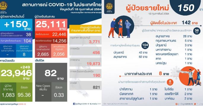 พบผู้ป่วยรายใหม่ 150 ราย ผู้ป่วยยืนยันสะสม 25,111 ราย หายป่วยแล้ว 23,946 ราย เสียชีวิตสะสม 82 ราย