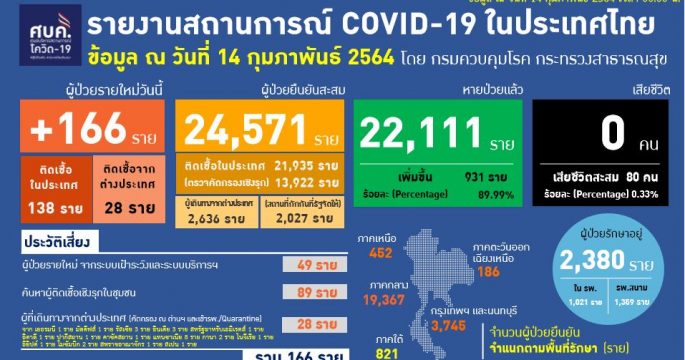 พบผู้ป่วยโควิดรายใหม่ 166 ราย ผู้ป่วยยืนยันสะสม 24,571 ราย หายป่วยแล้ว 22,111 ราย เสียชีวิตสะสม 80 ราย