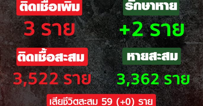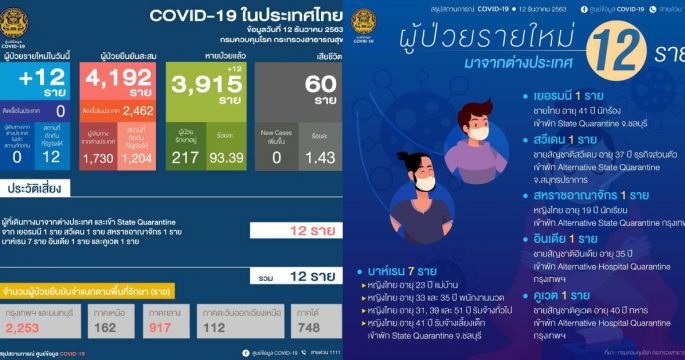 พบผู้ป่วยรายใหม่ 12 ราย ผู้ป่วยยืนยันสะสม 4,192 ราย รักษาหายเพิ่ม 12 ราย ยังรักษาอยู่โรงพยาบาล 217 ราย รวมหายป่วยแล้ว 3,915 ราย เสียชีวิตสะสม 60 ราย