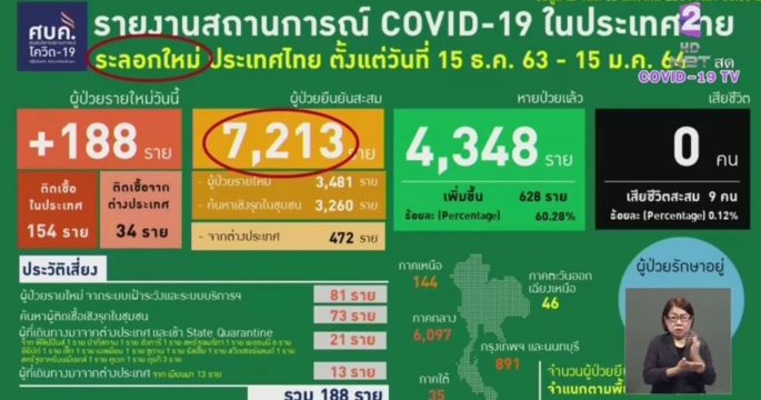 วันนี้พบผู้ป่วยรายใหม่ 188 ราย ผู้ป่วยยืนยันสะสม 11,450 ราย หายป่วยแล้ว 8,288 ราย เสียชีวิตสะสม 69 ราย