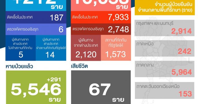 พบผู้ป่วยโควิดรายใหม่ 212 ราย ผู้ป่วยยืนยันสะสม 10,053 ราย หายป่วยแล้ว 5,546 ราย เสียชีวิตสะสม 67 ราย