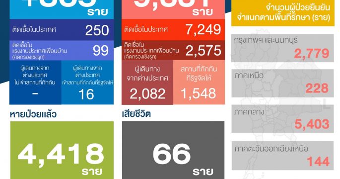 พบผู้ป่วยติดโควิด-19 เพิ่มอีก 365 ราย เสียชีวิตอีก 1 ราย ผู้ป่วยยืนยันสะสม 9,331 ราย เสียชีวิตสะสม 66 ราย