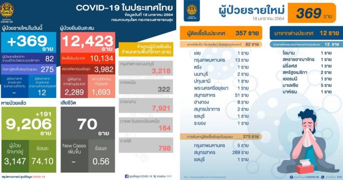 ผู้ป่วยรายใหม่ 369 ราย ผู้ป่วยยืนยันสะสม 12,423 ราย หายป่วยแล้ว 9,206 ราย เสียชีวิตสะสม 70 ราย