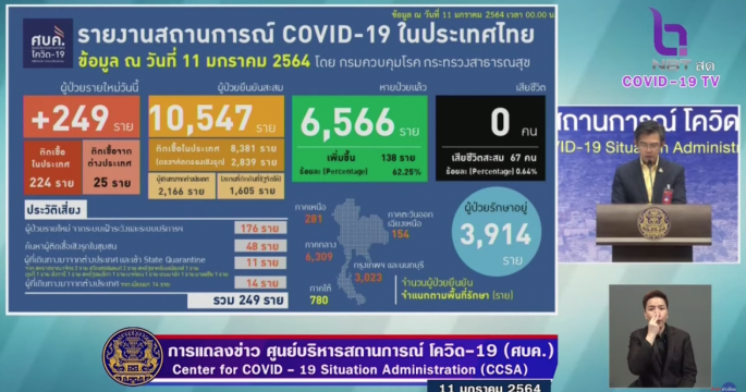 พบผู้ติดเชื้อเพิ่ม 249 ราย ผู้ป่วยสะสม 10,547 ราย หายป่วยสะสม 6,566 ราย ยังรักษาตัวอยู่ในโรงพยาบาล 3,914 ราย ยอดเสียชีวิตสะสมคงที่ 67 ราย