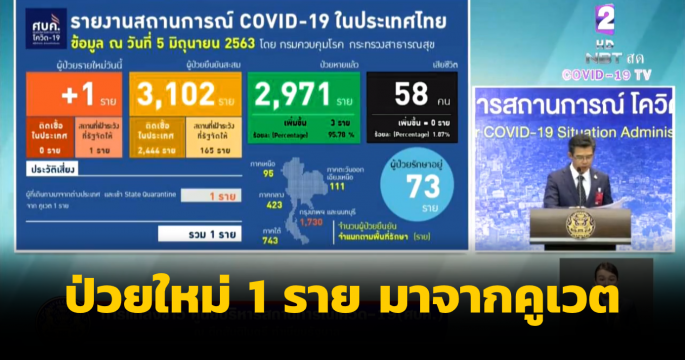 ไทยพบผู้ป่วยรายใหม่ 1 ราย มาจากประเทศคูเวตและเข้า State Quarantine สะสม 3,102 ราย ป่วยแล้ว 2,971 ราย รักษาในโรงพยาบาล 73 ราย เสียชีวิตคงที่ 58 ราย