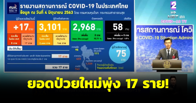 สถานการณ์โรคโควิด-19 ไทยพบผู้ป่วยรายใหม่ 17 ราย มาจากต่างประเทศ ผู้ป่วยสะสม 3,101 ราย รักษาใน รพ. 58 ราย ไม่มีตายเพิ่ม