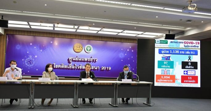 สธ.เผยพบคนป่วยโควิด-19 เพิ่ม 91 คน เสียชีวิต 1คน สะสมรวม 1,136 คน โดยผู้เสียชีวิตอายุ 50 ปีจาก รพ.สุไหงโกลก ส่วนแพทย์ที่ติดเชื้อโควิดไม่ใช่แค่รักษามาจากส่วนตัว