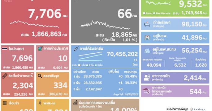 โควิดวันนี้ ยอดลดลงต่อเนื่อง ติดเชื้อเพิ่ม 7,706 ราย หายป่วยกลับบ้าน 9,532 ราย เสียชีวิต 66 ราย ขณะที่นับเป็นวันแรกในรอบ 103 วัน ที่มีจำนวนผู้ป่วยยืนยันรักษาน้อยกว่า 1 แสนราย